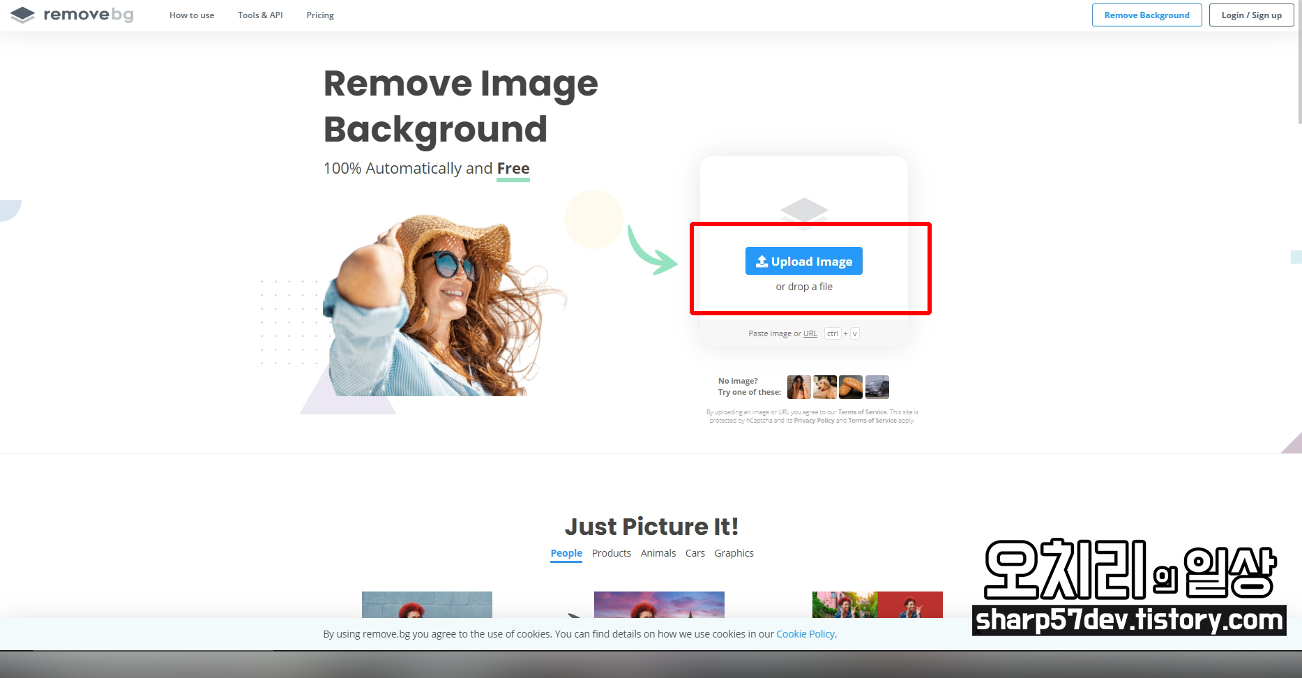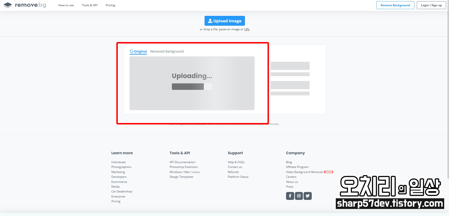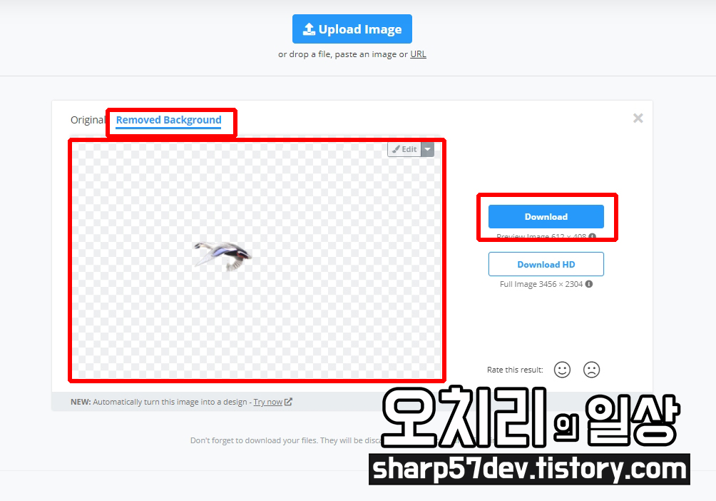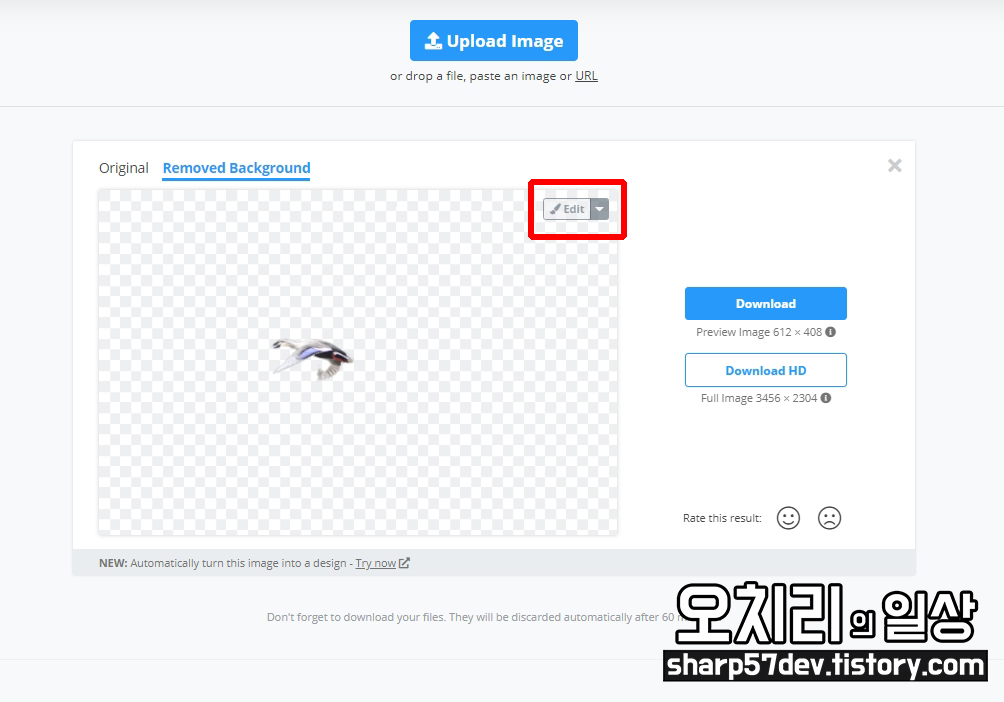 위 사이트를 들어가신 수 Upload Image 버튼을 눌러 누끼 딸 이미지를 선택합니다.