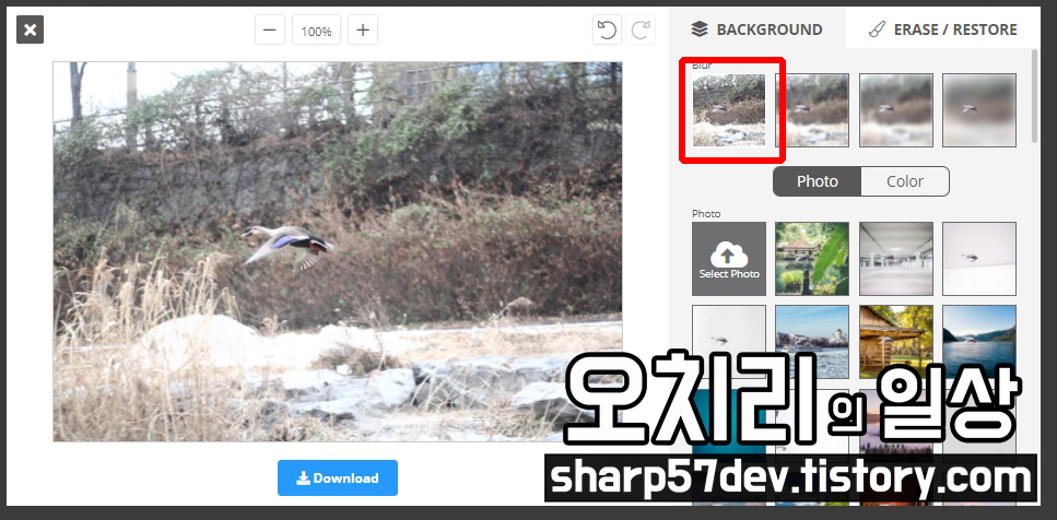 아래는 누끼 딴 청둥오리와 블러쳐리된 원본 배경 이미지를 합친 사진을 볼 수 있습니다.