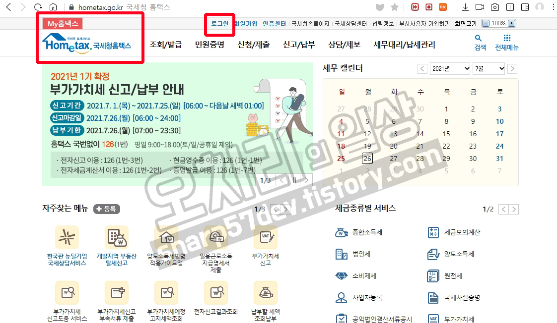 홈택스도 마찬가지로 화면 상단에 로그인 버튼을 누르시면 로그인 화면으로 넘어갑니다.