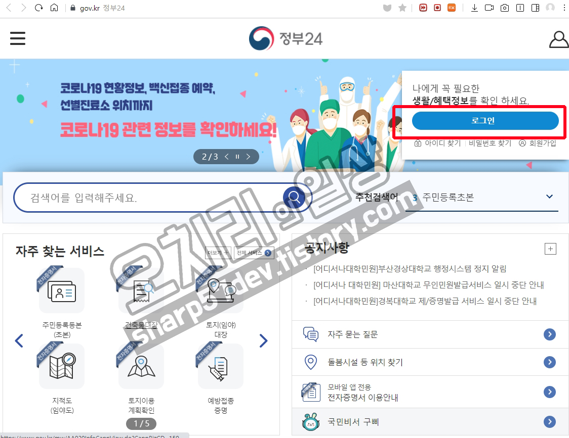정부24 오른쪽 상단에 로그인 버튼이 있습니다.