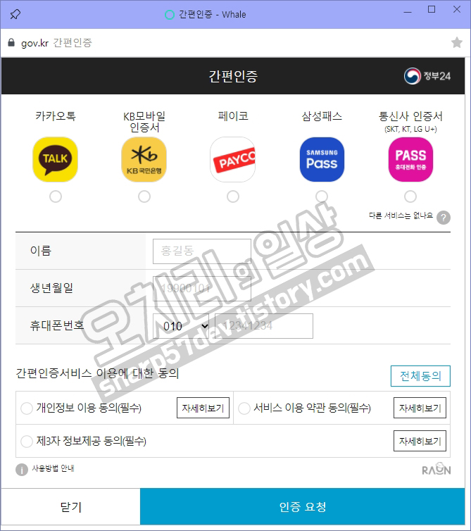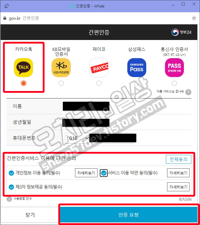 카카오톡을 선택하고 이름,생년월일,휴대폰번호를 입력하시고, 간편인증서비스 이용에 대한 동의도 필수이기 때문에 동의 체크를 하시고 마지막으로 인증 요청을 보냅니다.