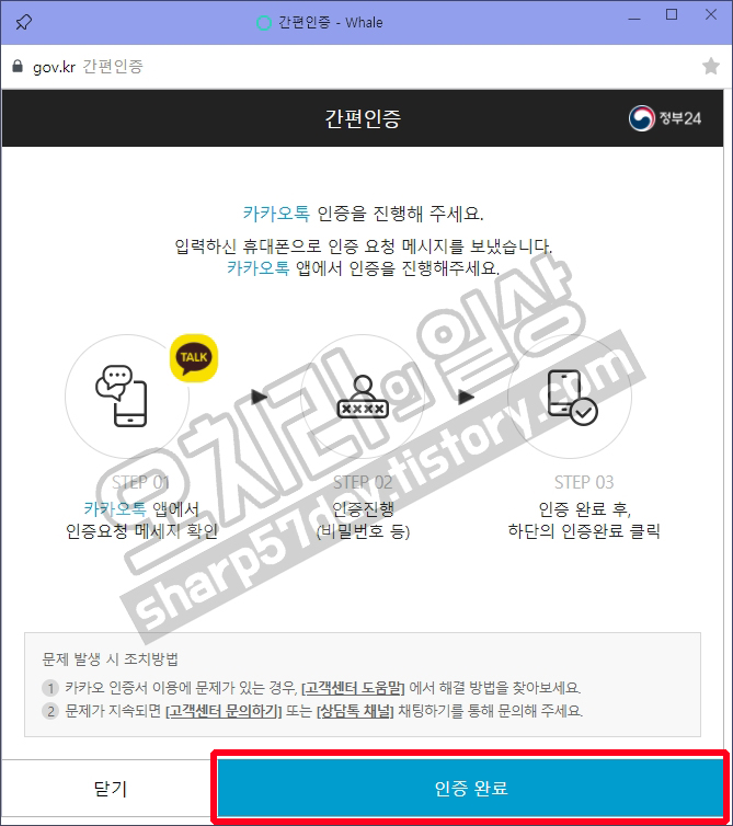 모바일로 인증이 확인되면 홈페이지 간편로그인 중인 [인증 완료] 버튼을 눌러 로그인을 마칩니다.