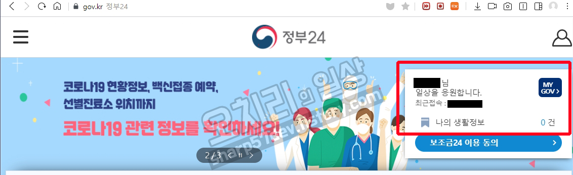 그럼 정부24에 로그인된 것을 오른쪽 상단에서 확인할 수 있습니다.