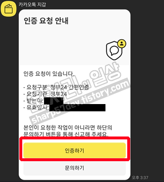 인증 요청을 보내면 위 이미지와 같이 카카오톡으로 로그인 인증 확인 톡이 날아옵니다.
