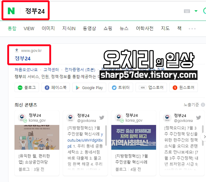 정부24에 접속하시려면 위처럼 네이버에서 정부24를 검색하시면 사이트가 검색됩니다.