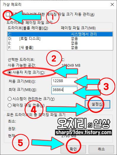 4번의 "설정"버튼을 클릭해야 수정한 가상 메모리 용량이 적용됩니다.