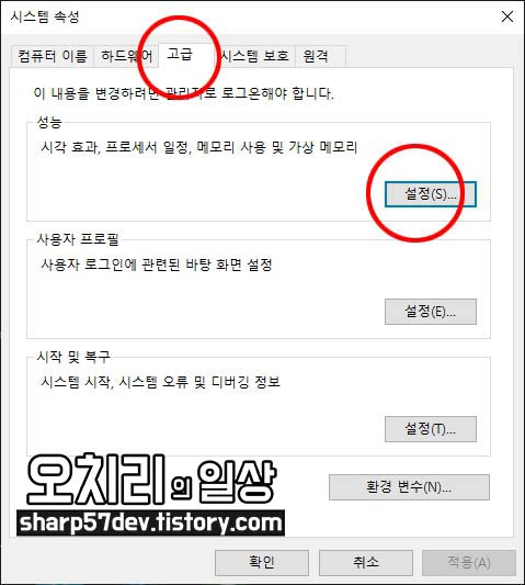 여기서 상단의 3번째 탭인 "고급" 탭을 선택한 다음, 첫 번째 설정인 성능 관련 "설정"버튼을 클릭합니다.