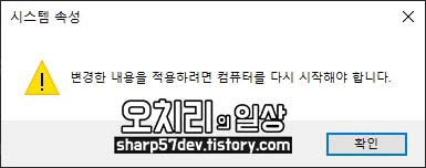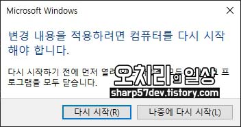 마지막으로 모든 설정이 끝나면 "변경 내용을 적용하려면 컴퓨터를 다시 시작해야 합니다"라는 알림 창이 뜨고 "다시 시작"을 클릭해 컴퓨터를 재부팅합니다.