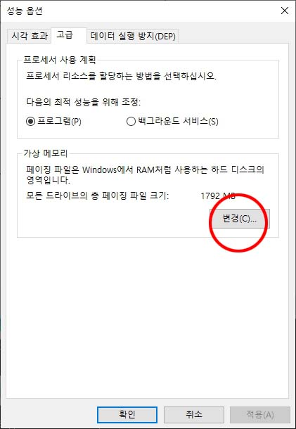 "가상 메모리" 창이 뜹니다.