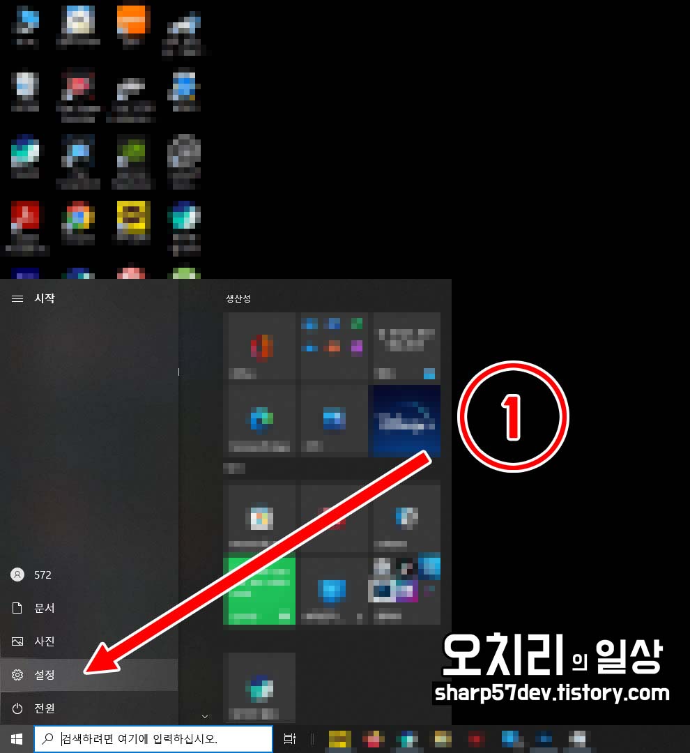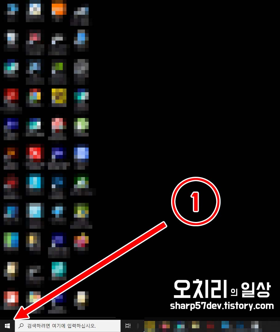 윈도우 바탕화면의 왼쪽 하단에 있는 1번의 "윈도우 시작" 버튼을 클릭합니다.