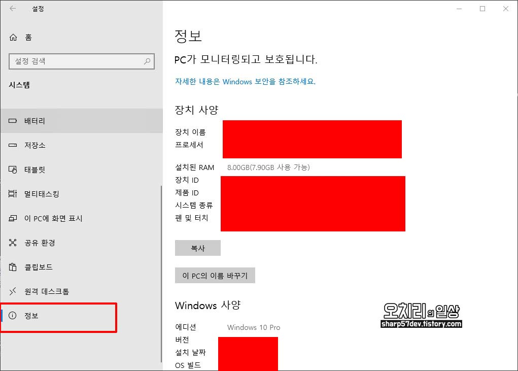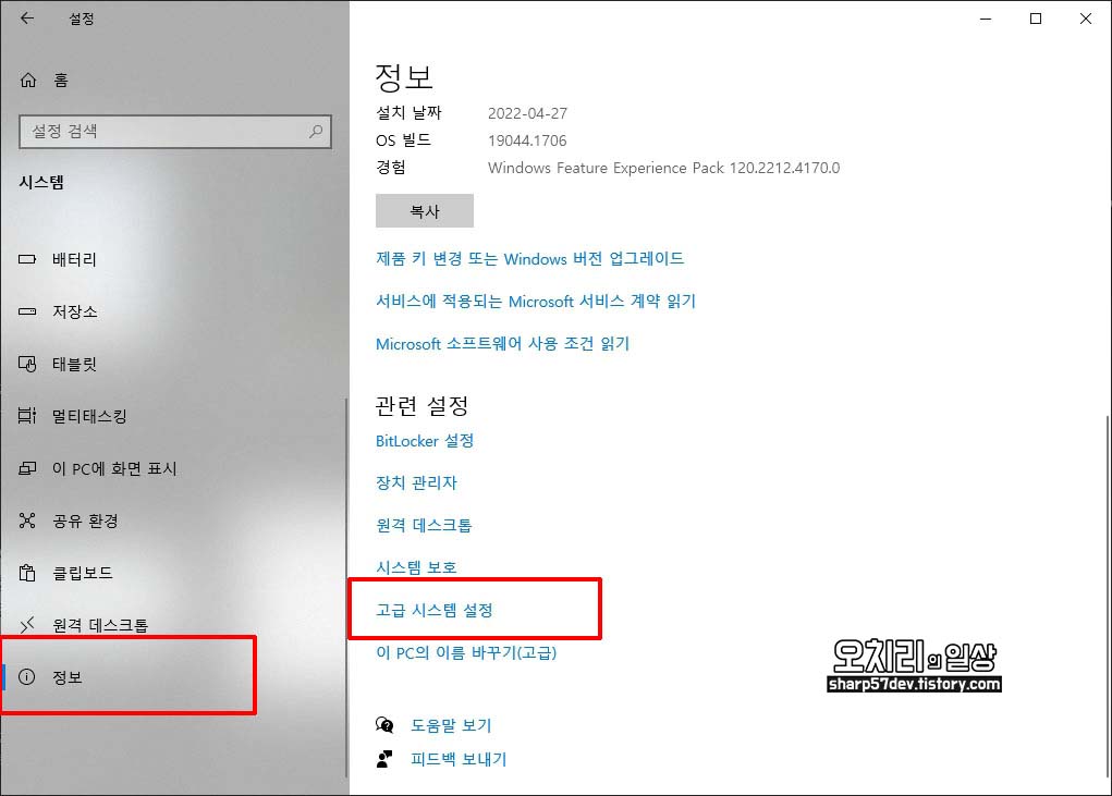 다시 "정보" 창의 하단으로 이동하여 "고급 시스템 설정"을 클릭합니다.