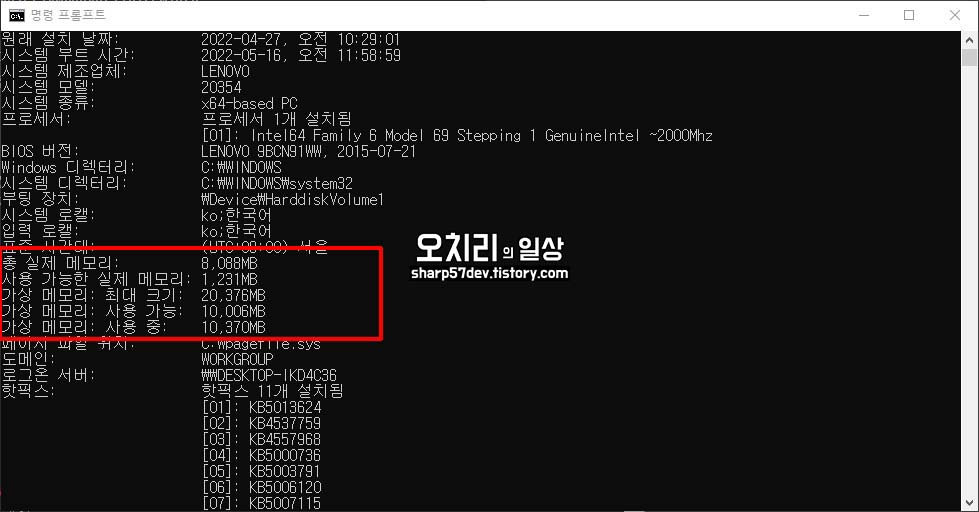 위는 가상 메모리를 변경 후에 실행한 가상 메모리 용량 확인입니다.