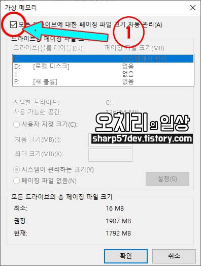 맨 위에 있는 1번(모든 드라이브에 대한 페이징 파일 크기 자동 관리(A)) 체크박스가 체크되어 있음을 알 수 있습니다.
