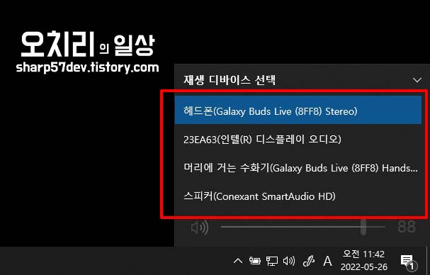 여기서 내가 듣고 싶은 소리 디바이스를 선택합니다.