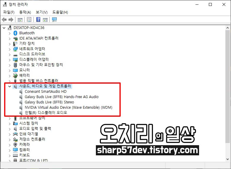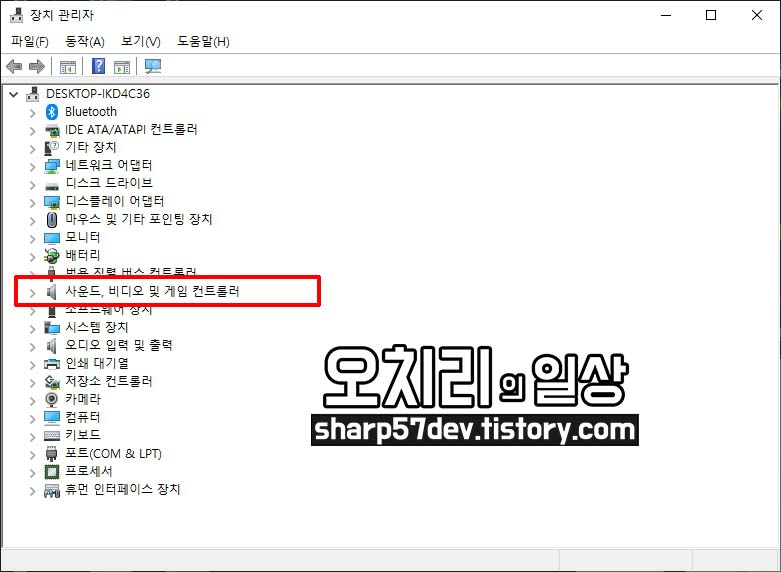사운드 드라이버가 설치되어있는 "사운드, 비디오 및 게임 컨트롤러"를 클릭하여 메뉴를 확장시킵니다.