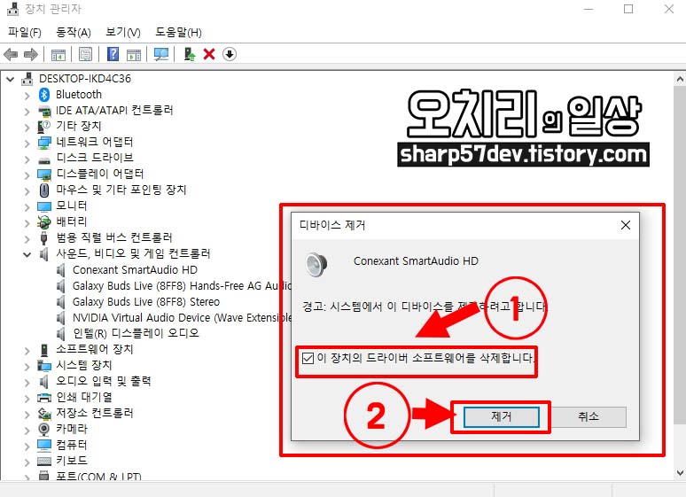 디바이스 제거 창이 뜨고 1번의 "이 장치의 드라이버 소프트웨어를 삭제합니다"를 체크 선택하고