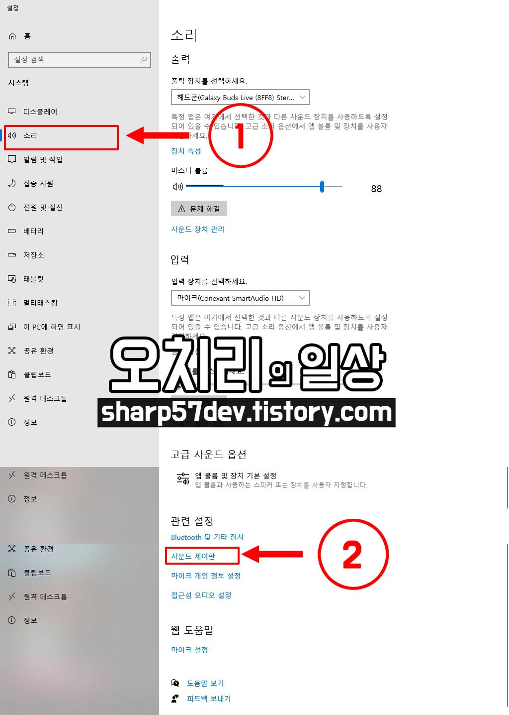 설정창이 뜨고 1번 [소리] 설정 창으로 이동합니다.