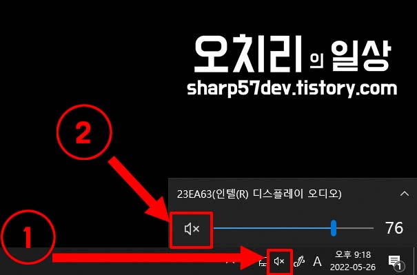음소거 상태일 때는 1번 소리 아이콘을 클릭한 후, 2번 음소거 아이콘을 좌클릭하여 음소거 모들 해제합니다.