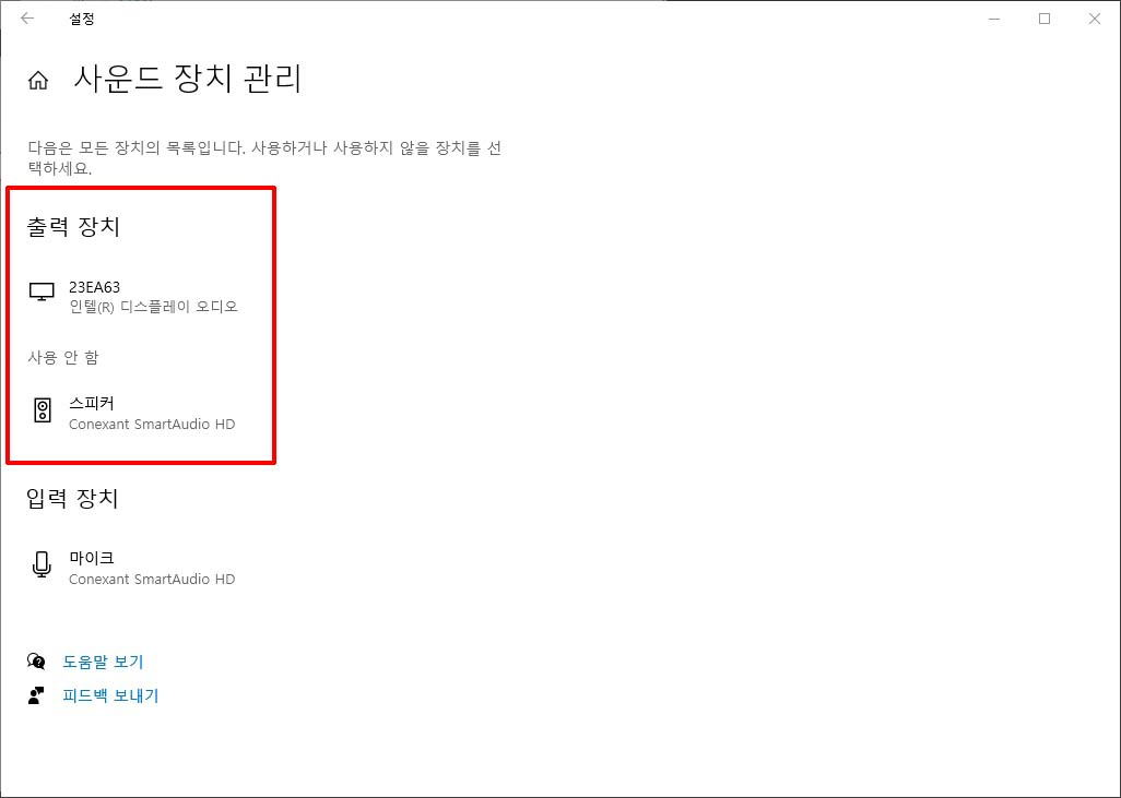 출력 장치에 "인텔 디스플레이 오디오" 장치와 "스피커" 장치가 있음을 확인할 수 있습니다.