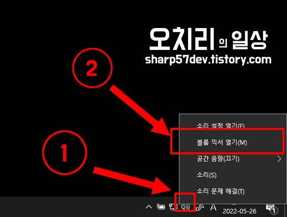 그리고 2번 [볼륨 믹서 열기(M)] 메뉴를 선택 클릭합니다.