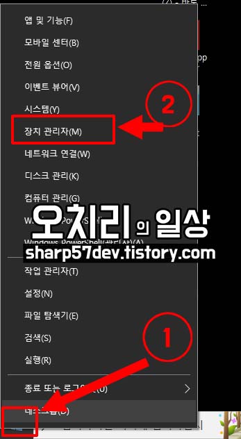 여러 콘텍스트 메뉴 중 2번[장치 관리자(M)]을 선택 클릭합니다.