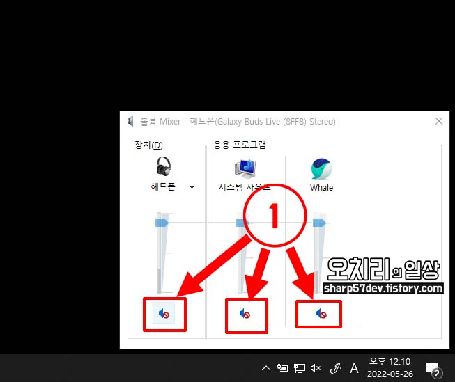 위 이미지의 1번 음소거 버튼이 모두 ON 되어 있어 아무 소리가 안나는 것을 확인할 수 있습니다.