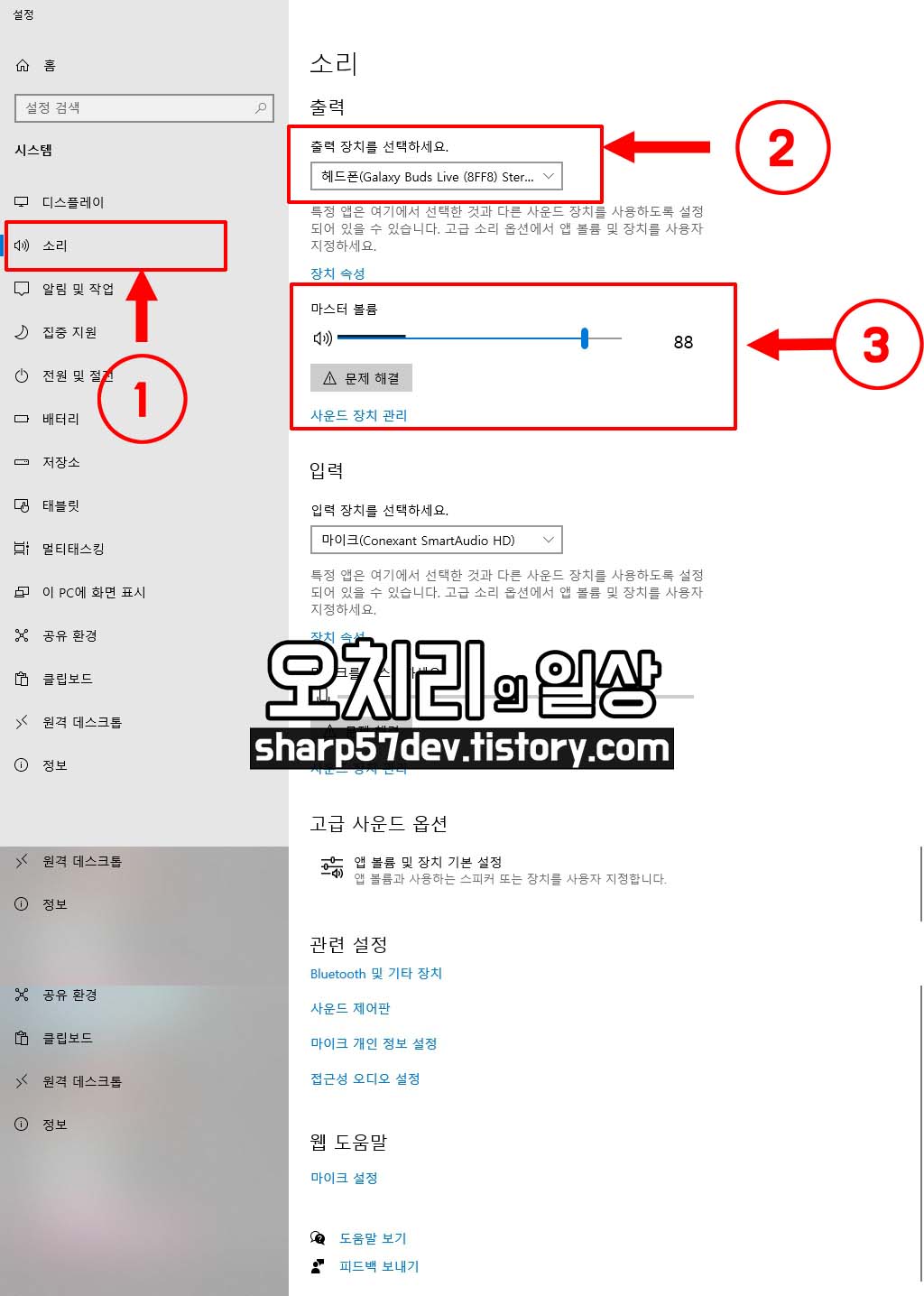 2번 출력 장치를 선택과 3번 마스터 볼륨 및 사운드 장치 관리에 대해 알아보겠습니다.