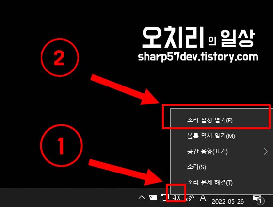 작업표시줄에 있는 1번 소리 아이콘을 우클릭합니다.