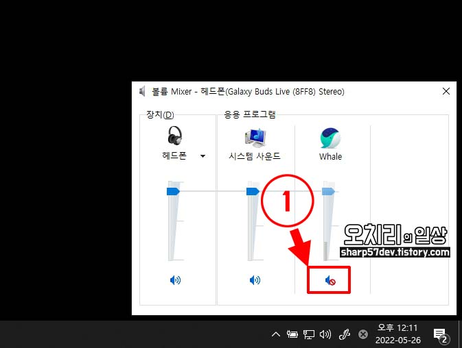 그리고 위 이미지는 1번 Whale 브라우저만 소리가 음소거되어있고, 시스템 사운드 응용프로그램과 헤드폰 장치는 음소거가 OFF 되어있어 웨일 브라우저만 소리가 안 나고 다른 시스템 사운드 등은 헤드폰으로 소리가 출력됨을 확인할 수 있습니다.