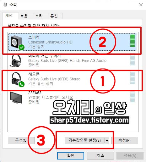 그럼 1번 헤드폰을 선택하고 3번[기본값으로 설정(S)]를 클릭하여 기본 장치를 선택해 줍니다.