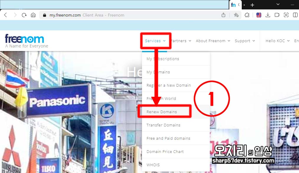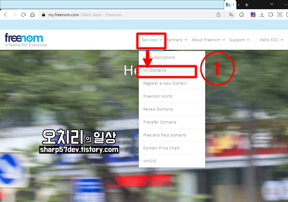 상단 메뉴 중에 ①[Services > My Domains] 화면으로 이동합니다.