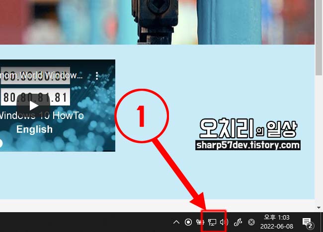 윈도우 우측 하단의 작업 아이콘 중 ①[인터넷 액세스]을 마우스 우클릭합니다.