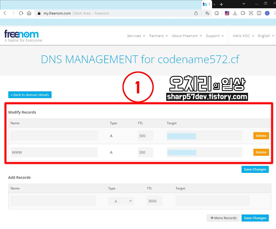 다시 ①[Manage Freenom DNS]으로 클릭하여 이동합니다.