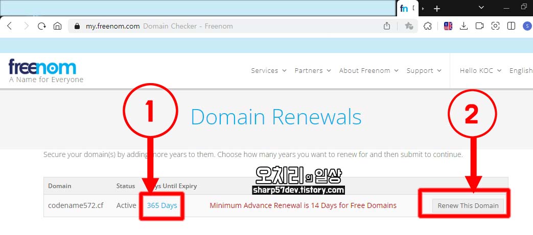 ②[Renew this Domain]을 클릭해야 도메인 연장 신청이 확정됩니다.