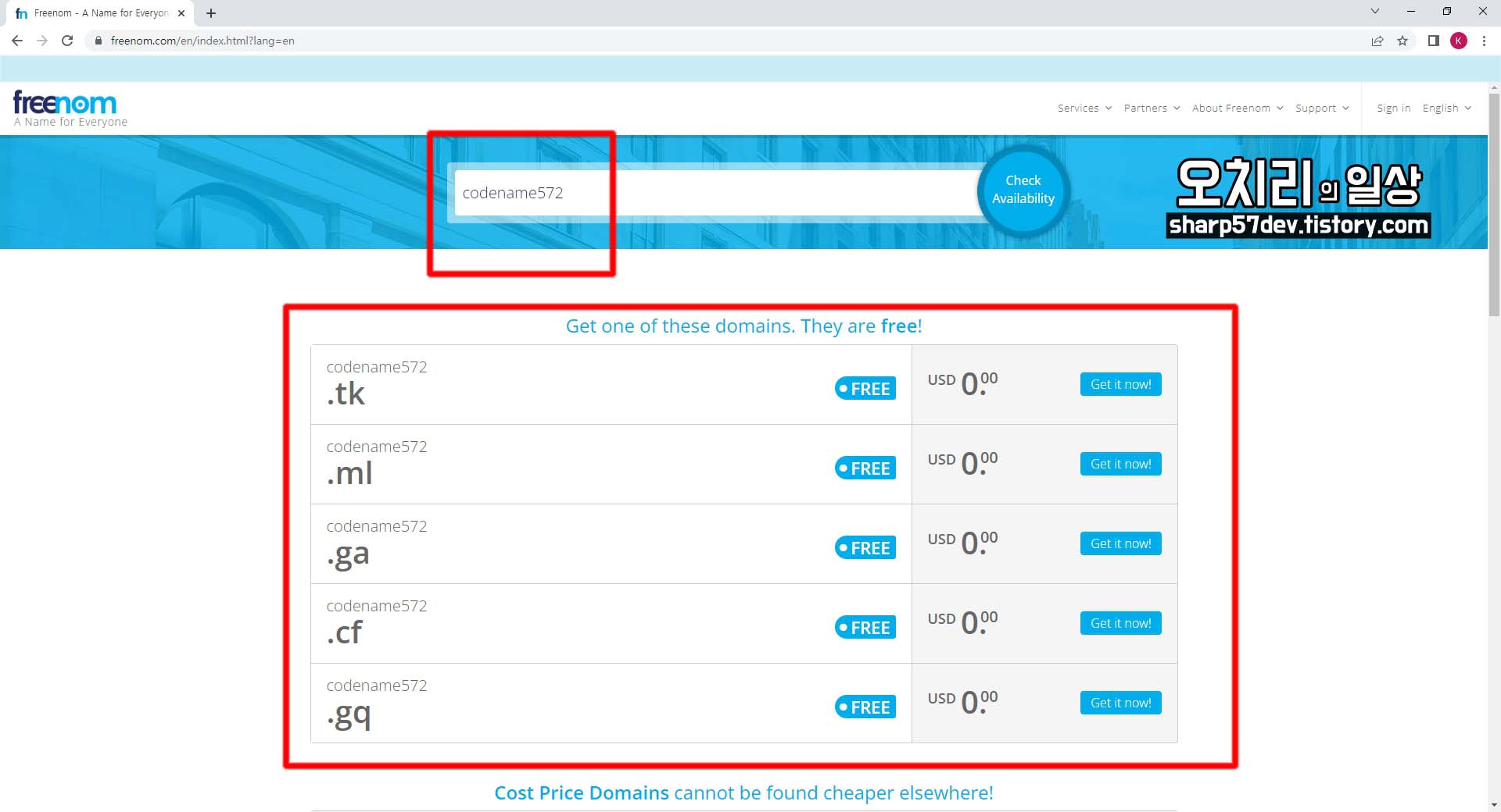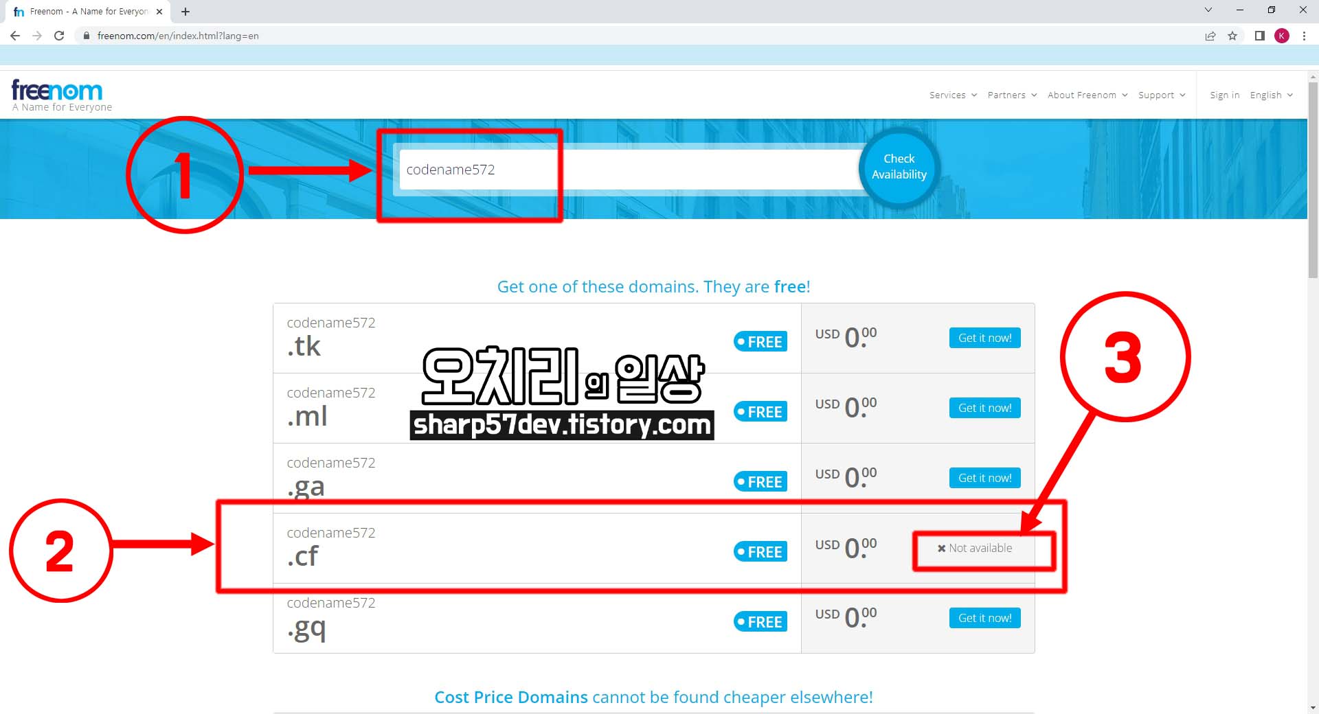 일단 저는 ①[codename572]로 도메인 검색을 하였고, 5가지 도메인 중 ②[cf]를 선택하여 ③[Get it now!]를 클릭합니다.