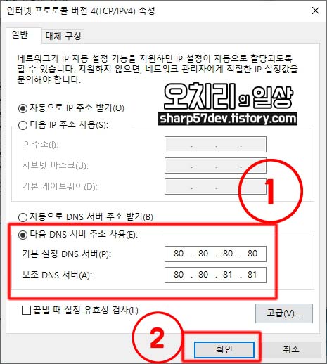 ①[보조 DNS 서버(A)]: 는 [80.80.81.81]로 입력하고