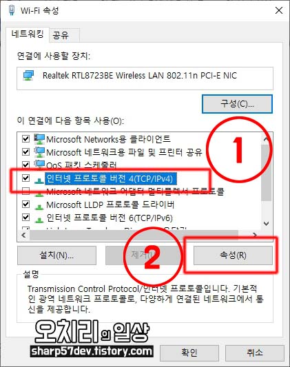 속성 창에서 [네트워킹 탭] -> [이 연결에 다음 항목 사용(O):] -> ①[인터넷 프로토콜 버전 4(TCP/IPv4)] 선택 -> ②[속성]을 클릭합니다.
