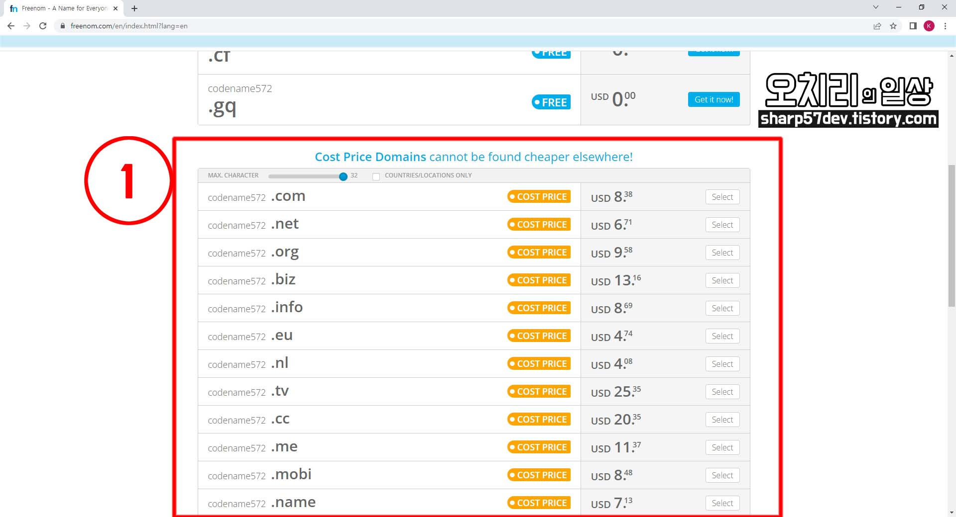 ①그 외의 유명한 도메인이거나 많이 사용하는 도메인은 유료로 구매할 수 있도록 무료 도메인 아래에 리스트로 정리해 놓은 것이 보입니다.