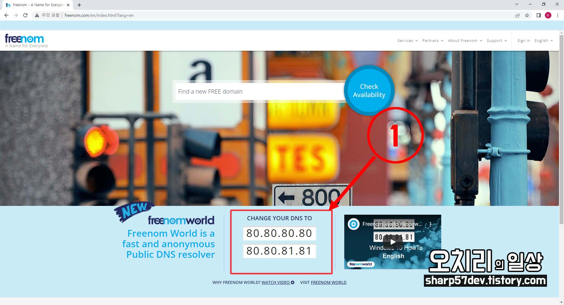 로그인과 도메인 검색은 나중에 하도록 하고, 웹 사이트 첫 화면 아래에 있는 ①[CHANGE YOUR DNS TO]처럼