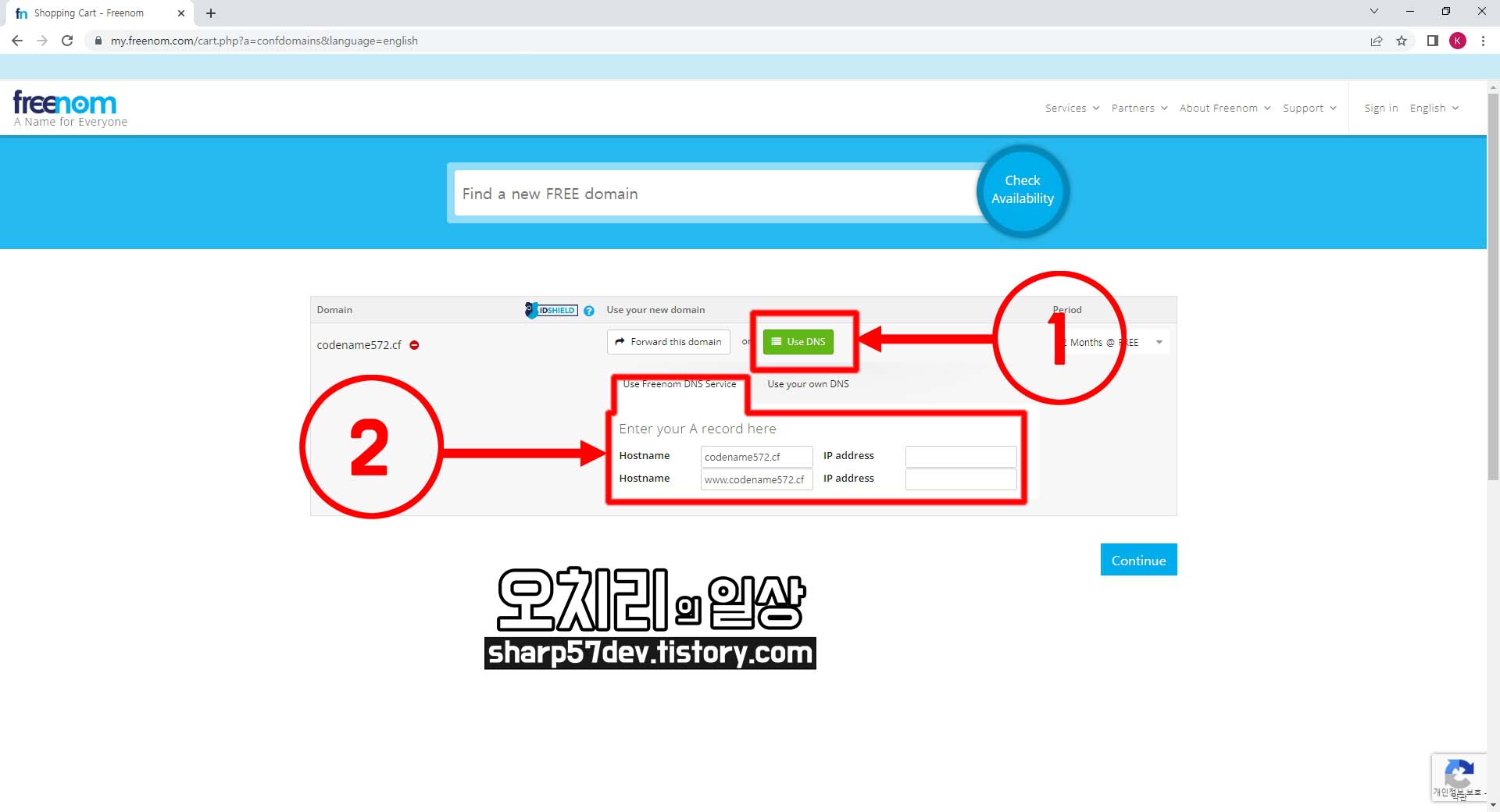 ①[도메인 검색 시, 내가 선택할 도메인까지 입력하고 검색하기] - 'codename572.cf'로 'cf'를 같이 입력 후 ②검색합니다.