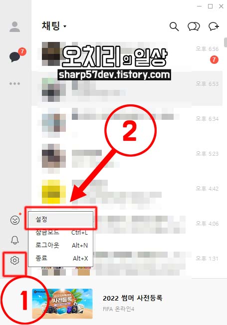 설정창에서 ①[채팅]메뉴를 클릭합니다.