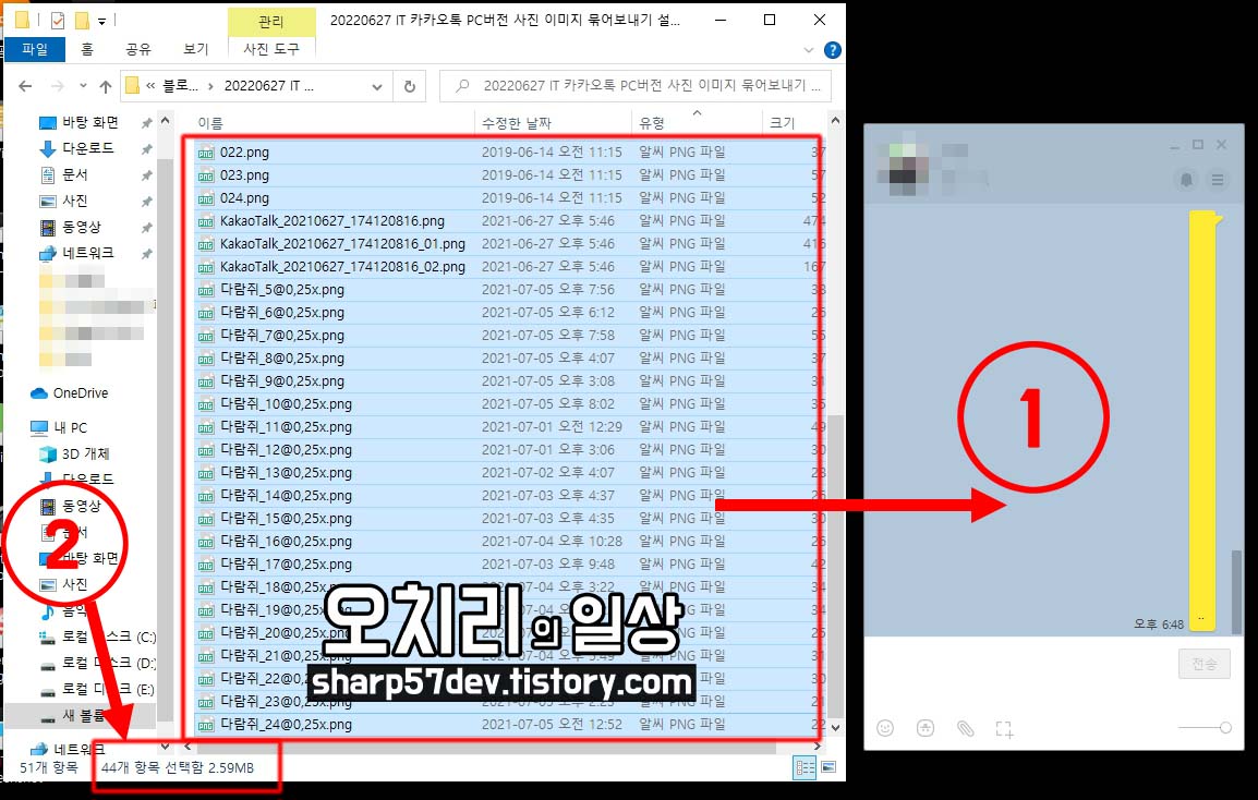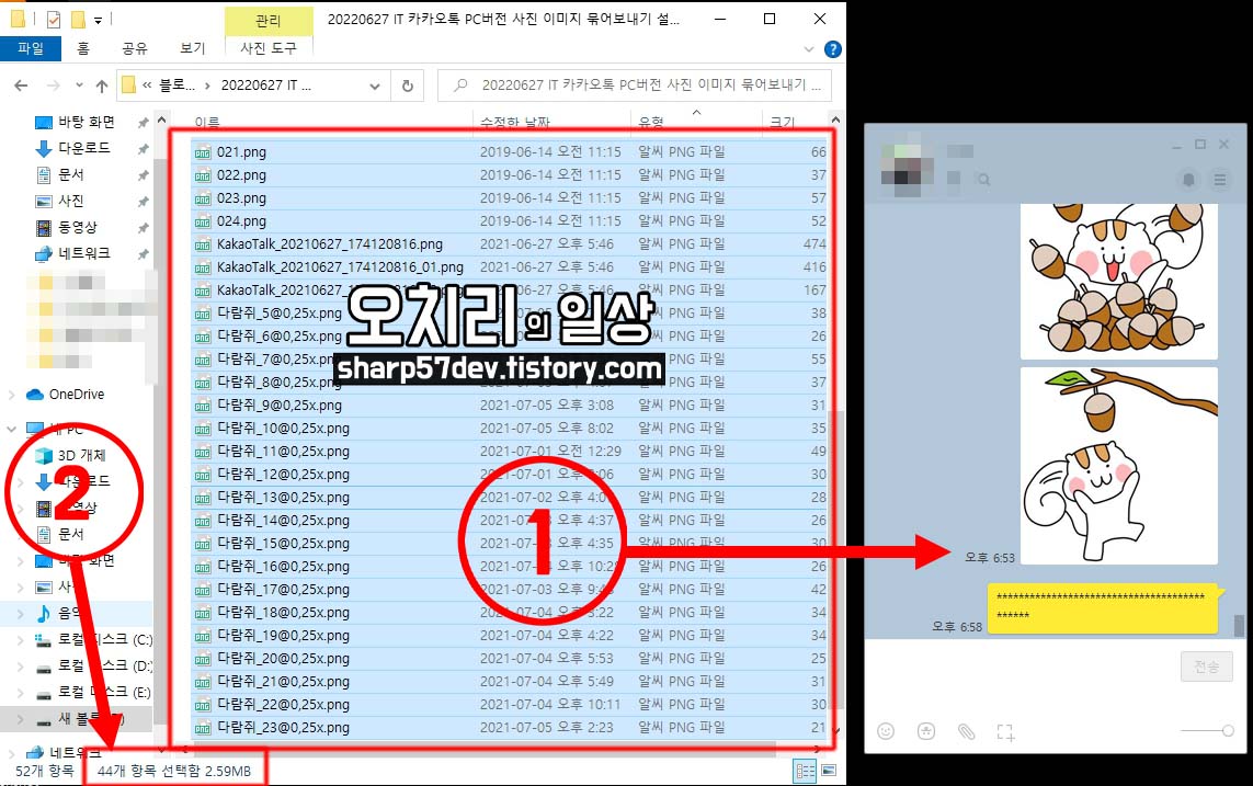 컴퓨터의 "파일 탐색기"를 열어 ②[사진44장]을 선택하여 일반 채팅 창으로 ①[사진 파일들을 드래그 앤 드롭] 합니다.