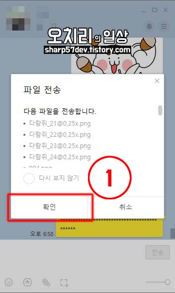 그러면 채팅창에 전송할 사진 목록이 나타나고 ①[확인]버튼을 클릭하여 전송합니다.