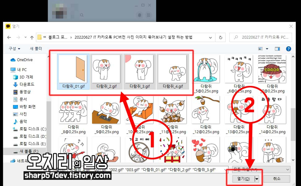 파일을 클릭으로 선택합니다. ①[움직이는 GIF 파일과 움직이지 않는 JPG, PNG 등의 사진을 함께 선택]하여 ②[열기] 버튼을 클릭하여 전송을 시작합니다.