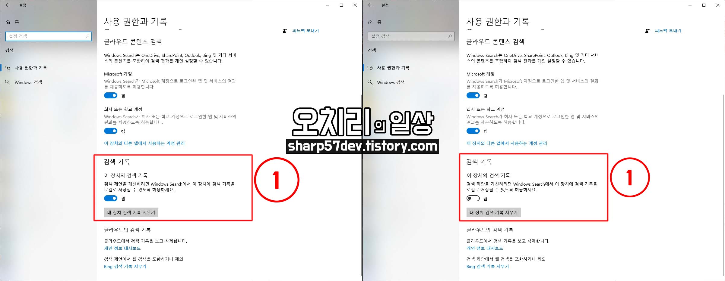 검색 기록 ①[이 장치의 검색 기록 - 검색 제안을 개선하려면 Windows Search에서 이 장치에 검색 기록을 로컬로 저장할 수 있도록 허용하세요.]를 왼쪽①[켬]에서 오른쪽①[끔]으로 전환하고, [내 장치 검색 기록 지우기] 버튼으로 기록을 지웁니다.