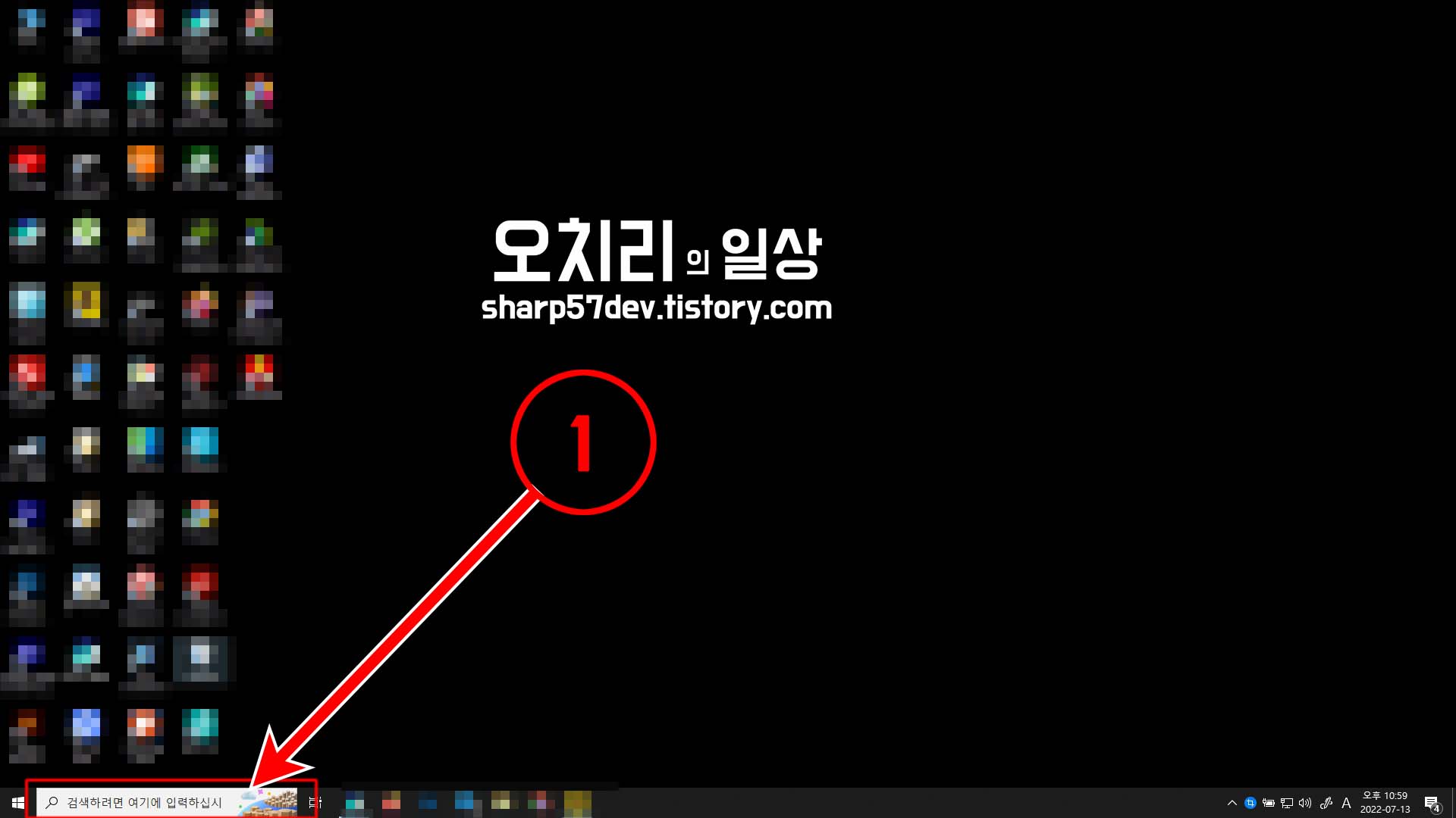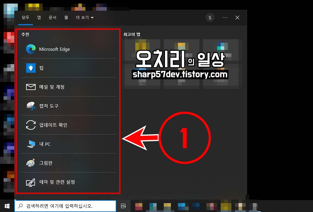 좌측 하단의 [시작]버튼 옆에 있는 ①[윈도우 검색창]을 입력하지 않고 클릭만 합니다.