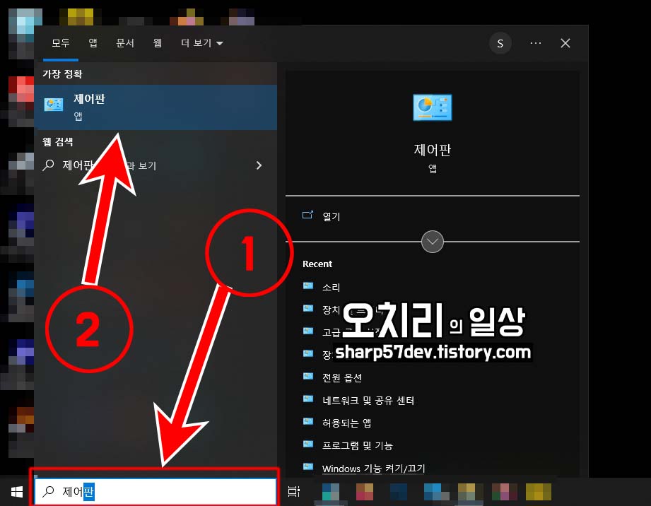 ①[윈도우 검색창]에 "제어판"이라고 입력하면 상단에 제어판 앱이 나타납니다.