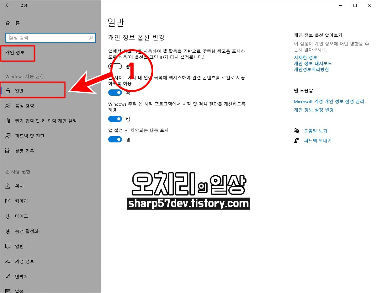 개인 정보의 ①[일반] 옵션에 들어왔습니다.
