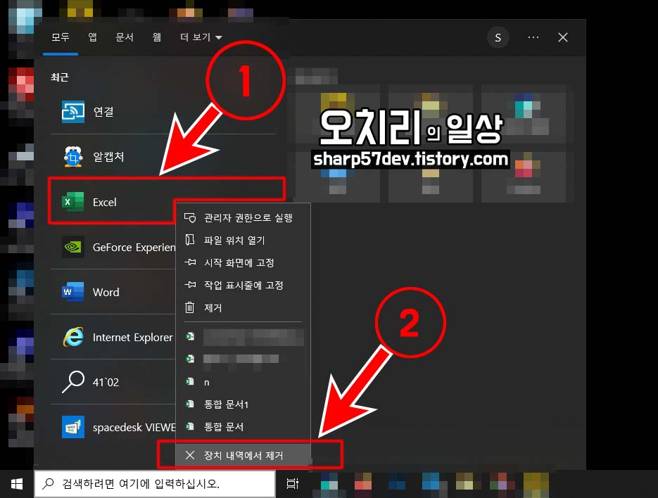 예로 엑셀을 사용한 내역을 삭제하고 싶다...라고 하면, ①[엑셀 목록]을 마우스 우클릭하여 컨텍스트를 띄우고, 맨 아래에 있는 ②[X장치 내역에서 제거]를 선택하면 선택한 항목이 삭제됩니다.