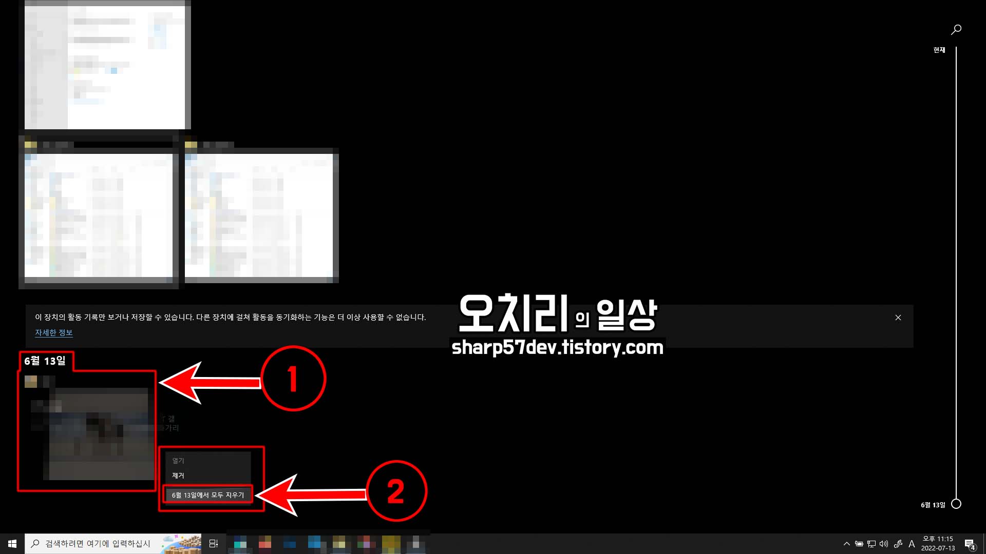 6월13일 내용은 어떠한 오류로 삭제가 제대로 안된 것 같아 ①[6월 13일]을 클릭하고, 마우스 우클릭으로 컨텍스트 메뉴를 열어 ②[6월 13일에서 모두 지우기] 메뉴를 클릭합니다.